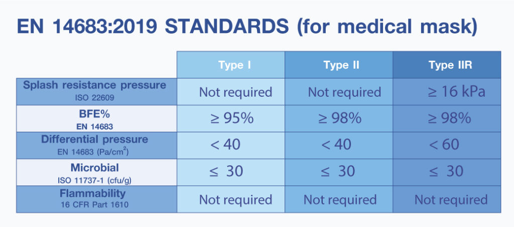 เพื่อสร้างความมั่นใจในประสิทธิภาพที่ดีของผลิตภัณฑ์หน้ากากทางการแพทย์ เพื่อใช้ในกลุ่มประเทศยุโรปทั้งหมด จึงได้กำหนดคุณสมบัติของ หน้ากากทางการแพทย์ที่เราสวมใส่นั้นอย่างมีประสิทธิภาพ สามารถ ป้องกันได้จริงโดยเฉพาะบุคลากรทางการแพทย์ เป็นผู้ที่มีความเสี่ยงสูงที่ต้องสัมผัสกับคนไข้ หรือบุคลากรทางการแพทย์ที่ต้องสัมผัสผู้มีความเสี่ยงสูงระหว่างปฏิบัติหน้าที่ EN 14683-2019 ได้กำหนด และ แบ่งคุณสมบัติมาตรฐานของหน้ากาก ทางการแพทย์ Medical face Mask or Surgical Face Mask โดยพิจารณาที่