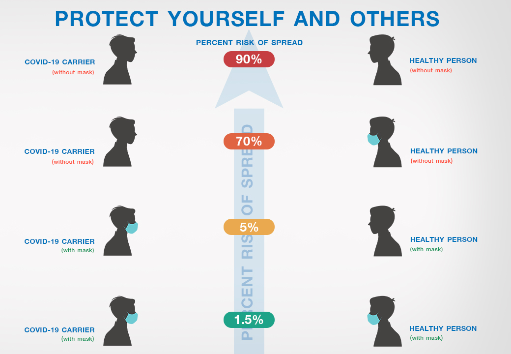 การสวมใส่หน้ากากที่มีคุณภาพและเหมาะสมกับวัตถุประสงค์ของการใช้งานจะช่วยลดการแพร่กระจายของ ไวรัสโควิท 19 ซึ่งจะมีการแพร่กระจายจาก คนสู่คนผ่านทางทางละอองฝอยจากทางเดินหายใจจากคนหนึ่ง แล้วฟุ้งกระจายไปในอากาศเมื่อเมื่อมีการไอ จาม พูด ตะโกน หรือร้องเพลง แล้วละอองฝอยเหล่านี้ก็จะฟุ้งกระจายไปเข้าจมูก ปาก ของคนที่อยู่ใกล้ๆผู้ติดเชื้อที่หายใจเอาเข้าไป